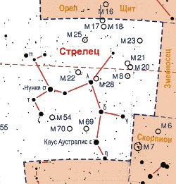 Стрелец — старинное созвездие, лежащее на зодиакальном поясе между Козерогом и Скорпионом. Самые яркие звезды — Каус Аустралис (ε Стрельца, 1,8m) и Нунки (σ Стрельца, 2,1m).