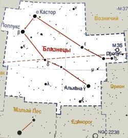 Близнецы – зодиакальное созвездие, известное с древних времен. Невооруженным глазом в ясную ночь в Близнецах можно разглядеть около семидесяти звезд, из них 14 ярче третьей звездной величины. Наиболее яркие звезды – Кастор («кучер», α Близнецов, 1,2m) и Поллукс («кулачный боец», β Близнецов, 1,6m).