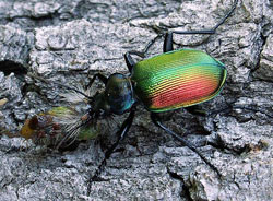 Конечно, не для борьбы с человеком наделила природа красотела таким средством химической защиты. Обитая в кронах деревьев, да еще среди массы гусениц, он постоянно сталкивается с насекомоядными птицами. А внизу под пологом деревьев – с многочисленными вечно голодными грызунами. Не будь у него такого изощренного оружия, пернатые и хвостатые хищники давно истребили бы всех красотелов. Целям защиты служит и его яркий наряд. Красотел как бы напоминает птицам: «Быстрее узнайте меня и вспомните, что лучше со мной не связываться». И птицы за долгий период сосуществования с этим заметным насекомым научились отличать его от других видов и оставляют красотела в покое.