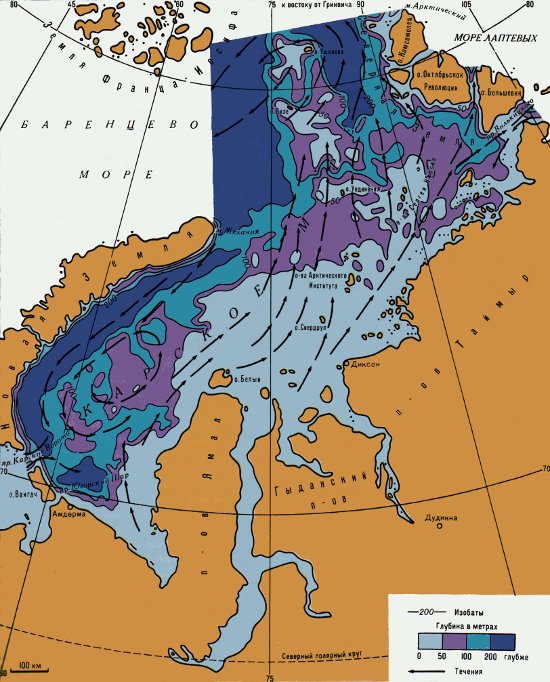 В значительно большей степени развита осенне-зимняя конвекция. Наиболее благоприятные условия для плотностного перемешивания складываются у западных берегов Северной Земли, где наблюдаются довольно слабая стратификация вод, быстрое выхолаживание и интенсивное льдообразование. Конвекция здесь проникает до горизонтов 50—75 м. Подобные условия для развития конвекции и примерно такие же глубины ее распространения отмечаются в юго-западной и северо-западной частях моря. В центральных районах и в Обь-Енисейском мелководье, находящихся под влиянием материкового стока, конвекция развивается лишь за счет осолонения при льдообразовании и достигает дна только к концу зимы. Сползание вод по подводным склонам усиливает вертикальную циркуляцию в районах с резко изменяющимися глубинами.