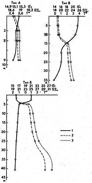 Типы вертикального распределения температуры (1), солености (2) и плотности (3) воды в арктических морях