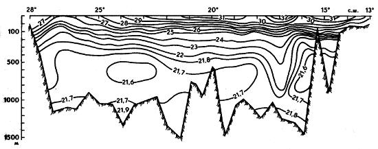 Глубинная вода распространяется в южном направлении и прослеживается по минимуму температуры (21,6—21,7°) в слое 500—800 м. Летом минимум температуры выделяется почти вдоль всего моря. В придонном слое отмечается небольшое повышение температуры и солености, предположительно связанное с влиянием горячих рассолов, заполняющих глубоководные впадины. Вопрос о взаимодействии рассолов с водами моря изучен пока недостаточно.