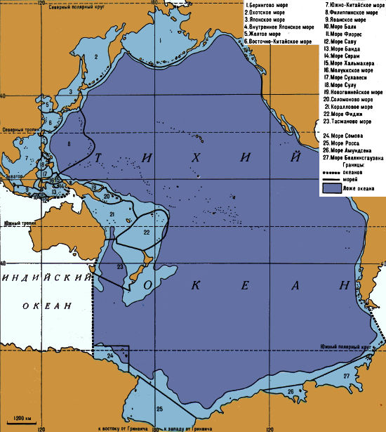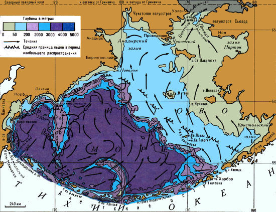 Самое большое из дальневосточных морей, омывающих берега России,— Берингово море расположено между двумя материками — Азией и Северной Америкой — и отчленено от Тихого океана островами Командорско-Алеутской дуги. Его северная граница совпадает с южной границей Берингова пролива и тянется по линии м. Новосильского (Чукотский п-ов) — м. Йорк (п-ов Сьюард), восточная проходит по побережью Американского материка, южная — от м. Хабучь (п-ов Аляска) через Алеутские острова до м. Камчатский, западная — по побережью Азиатского материка.