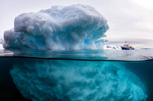 Айсберги, ледяные горы, обломки льдов полярных ледников сползающих в море и там обламывающихся. Айсберги достигают в длину 1 км и более при высоте свыше 100 метров. Особенно велики айсберги южного полушария, где наблюдались ледяные глыбы до 100 и более километров в длину; надводная часть айсберга составляет приблизительно 1/3 или 1/5 подводной части; в этом отношении наблюдаются значительные колебания в зависимости от формы подводной части айсберга и плотности морской воды. Образуются айсберги в северном полушарии главным образом у берегов Гренландии, Шпицбергена, Земли Франца-Иосифа, в южном — у берегов Антарктиды. В северном полушарии они доплывают до Ньюфаундленда и южнее, попадая на пути судов, плавающих между Нью-Йорком и Европой, в южном — до 35° ю.ш., обломки же их были отмечены даже на 26°30' ю.ш. Айсберг представляет большую опасность для судов, пересекающих Атлантический океан между Европой и Северной Америкой. От столкновения с айсбергом погиб в 1912 году громадный океанский пароход «Титаник». Движение айсбергов регистрируется особой службой и об их местонахождении все суда извещаются по радио.