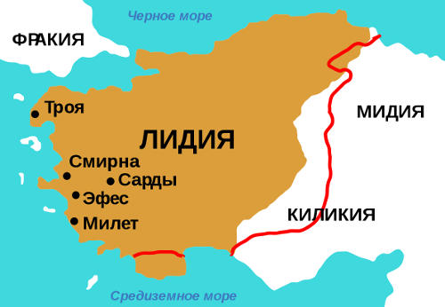 Лидия — государство на западе Малой Азии. Историки предполагают, что первые в мире монеты из серебра и золота стали чеканить именно здесь в VII веке до н.э. Ее последним правителем был легендарный Крёз. Его богатство вошло в древности в поговорку. «Богат, как Крёз» — так говорили и до сих пор говорят об очень богатом человеке. Завоевано Киром II Великим. Перед началом войны с Персией Крез обратился к предсказателям, желая получить ответ об исходе воины. Те дали двусмысленный ответ: «Перейдя реку, ты погубишь великое царство». Так и случилось. Крёз решил, что речь идет о Персидском царстве, но погубил свое собственное царство, потерпев сокрушительное поражение от Кира.
