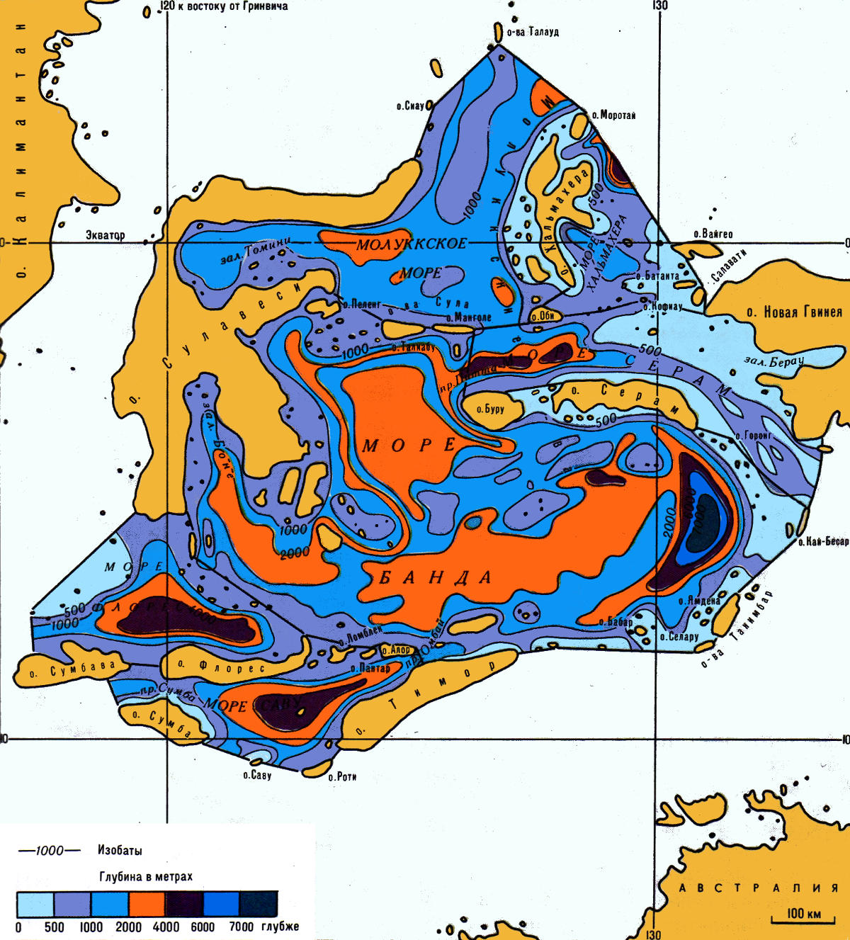 Рельеф дна морей Флорес, Саву, Банда, Серам, Хальмахера, Молуккского. Увеличить (в отдельном окне)