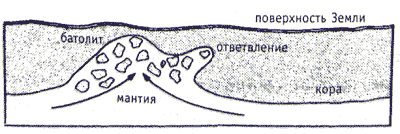 Батолит – крупное интрузивное тело неправильных очертаний, сложенное главным образом гранитоидами и залегающее в земной коре среди осадочных толщ складчатых областей. По мере остывания батолита образуются крупнозернистые горные породы (например, граниты). Возможны выходы батолитов на поверхность земли при разрушении и удалении покрывающих их толщ процессами выветривания или эрозии. Плато Дартмур и Эксмур на юго-западе Великобритании – ответвления батолита.